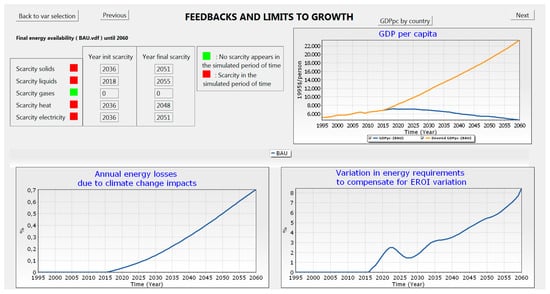 - Feedback and limits to growth: Annual energy losses due to climate change impacts, variation in energy requirements to compensate for EROI variation, final energy availability, GDPpc (Figure 3).