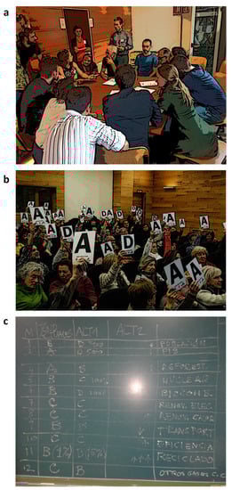 Pictures from 3 of the game workshops performed of Global Sustainability Crossroads: (a) group discussion facilitated by moderators in the Club of Rome Summer Academy (Florence, Italy) (1) (decisions taken by consensus within the group); (b) vote during assembly game workshop during the “Playing to Manage the World” event (Valladolid, Spain); (5) and (c) measures selected for the BAU and two consecutive alternative scenarios by the participants in the assembly game during the 15th Conference and Trade Fair of Green Building (Aínsa, Spain) (6).