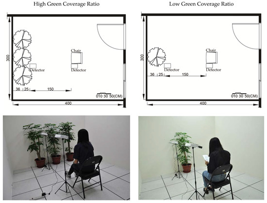 The Rural Development Administration of South Korea recommends installing one large potted plant and one small potted plant per 6 m2 floor area in a room [29]. US studies have also recommended placing at least one 6-in (15.24 cm) potted plant per 9 m2 floor area in a room [30] to purify indoor air. Since the room in which our experiment was conducted had a floor area of 12 m2 at least two large potted plants (diameter of 24 or 30 cm) and two small potted plants (diameter of 18 cm) should be installed to improve the indoor air quality. For simplicity, this study selected only large potted plants (pot diameter 37 cm and plant height of around 1.3 m) because the eye of a sitting person is at a height of approximately 1.1 m from the ground [31]. The indoor plant used was the evergreen Radermachera hainanensis Merr. a shade-bearing tree whose brightly colored leaves give the plant its ornamental value [32]. Though this tree has become popular for indoor use in Taiwan in recent years, its ability to improve air quality and its influence on people’s responses has never been examined. Plants tested in experiments for their effects should be used as plants are normally used in daily living. The plant pots were made of plastic. The growing medium was potting soil. Since we viewed the plants, pots, and potting soil as a whole unit, we did not distinguish the possibly different influences of the plants, pots, and potting soil.