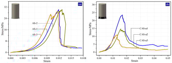 During the experiment, the coal-rock structure was set with coal end at the bottom and rock end on the top to simulate the composite roof of the roadway. When the test machine exerted force loading, the lower test bed moved upward while the upper test bed remained still. Figure 2 displays the stress-strain curves of seven coal-rock structures. As can be seen from Figure 2, the stress-strain curves of coal-rock structures with different height ratios are elastic in essence. The deformation of the samples is divided into three stages: compressive stage, elastic stage, and post-peak stage. The deformation characteristics of the coal-rock structures with different height ratios also differ from each other in the three stages. As the height of coal increases gradually, the deformation increases accordingly in the compressive stage; the gradient tends to decrease during the elastic stage, and the deformation decreases during the post-peak stage. It can be obtained from Figure 2a and Figure 3 that the change trends of stress-strain curves of three groups of sandstone samples are quite similar, and the peak loads (30.22 MPa, 30.31 MPa, 28.89 MPa, respectively) are close to each other. The average strain value corresponding to the peak load is 0.012, and the failure of the samples is mainly tensile failure. As is shown in Figure 2b and Figure 3, when the coal-rock height ratio is 1:7, the stress-strain curves of the samples are different from that of pure rock mass. The peak loads decrease sharply to 23.55 MPa, 14.67 MPa, and 10.91 MPa, respectively. In the coal-rock structures (CAS-a1–a3), failure firstly occurs in the coal mass. As the loading force increases gradually, the coal mass deforms constantly until it is crushed into pieces. The rock mass bears the loading in the process of deformation, which indicates that the CAS-a coal-rock structure displays a long-term loading characteristic. As is shown in Figure 2c and Figure 3, when the coal-rock height ratio is 1:3, the peak loads further decrease to 12.10 MPa, 13.47 MPa, and 16.18 MPa, respectively. As is shown in Figure 2d and Figure 3, when the coal-rock height ratio is 1:1, the peak loads decrease to 5.37 MPa, 9.09 MPa, and 6.51MPa, respectively; the average strain value corresponding to the peak load rises to 0.016. As for the coal-rock structure, CAS-b and CAS-c, failure mainly occurs within the coal mass, with a large number of fractures developing and distributing evenly in both the side and end faces of the coal mass. The failure, in this case, is mainly splitting failure. When the load exceeds peal load, and structural failure occurs in the sample, the fracture in the interface between coal and rock mass extends into the rock mass, which causes tensile failure. The fracture extension produces a larger amount of energy, which primarily justifies the local failure in the upper rock mass. As is shown in Figure 2e,f, when the thickness of coal mass continues to increase and the coal-rock height ratios reach 3:1 and 7:1, respectively, the average peak loads of CAS-d and CAS-e are 6.99 MPa and 7.14 MPa, with no remarkable difference observed. This is because when the height of the coal mass exceeds that of the rock mass, the load is mainly borne by the coal mass, and the failure is mainly splitting and tensile failure. The energy released by the fracture extension does not lead to the failure of the rock mass. From Figure 2g, it can be observed that the peak loads of pure coal samples are 6.63 MPa, 6.65 MPa, and 6.16 MPa, respectively, and the average strain value corresponding to the peak load is 0.018. After the peak load, many perforating fractures are generated within the coal mass, and the failure, in this case, is tensile failure. As is shown in Figure 3, the peak load of the coal-rock structure is correlated positively with the thickness of the rock mass, and negatively with the thickness of the coal mass. When the thickness of the coal mass exceeds that of the rock mass, the peak load of the coal-rock structure tends to be that of the coal mass.