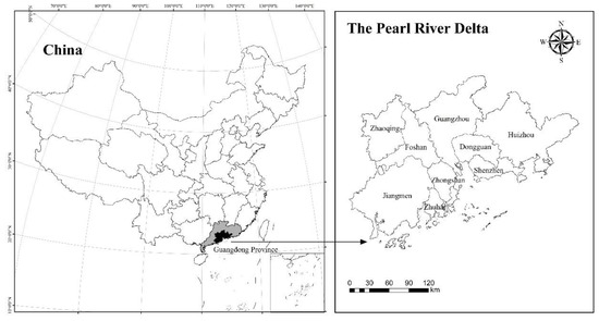 The PRD was selected as the research area; it comprises Guangzhou, Shenzhen, Dongguan, Foshan, Zhuhai, Huizhou (excluding Longmen county), Zhongshan, Jiangmen, and Zhaoqin (excluding Huaiji, Deqing, Guangning, and Fengkai) (Figure 1). The total area of this region is 41,711 km2. The resident population was 59,126,800 in 2017. From the mid- to late-1970s, foreign capital significantly promoted the industrialization of the PRD, which transformed it into a “world factory” in the global economy. This region witnessed the strategic coupling of production factors (e.g., cheap land and labor), with leading firms in the GPN [11,12]. Although the significance of engaging in the GPN for promoting industrialization and urbanization of the PRD is recognized in the current literature, such a development model is also criticized heavily [8]. In 2008, the Central Government of China clearly stated in the “Outline of the Reform and Development Plan of the Pearl River Delta Region (2008-2020)” that the PRD suffers from multiple issues, including a low industrial level, low value-added products, inadequate innovation ability, and weak overall competitiveness. Additionally, the PRD faces a huge crisis of sustainable development. In the same year, the Guangdong Provincial Government proposed the “Empty the cage for Birds” strategy to promote industrial upgradation of the PRD and to free up space for high-tech industries with high added values by shifting the local low-end labor-intensive industries. In 2019, the Central Government of China issued “The development plan for Guangdong-Hong Kong-Macao Greater Bay Area.” This plan clearly proposed the development strategy of transforming the PRD, Hong Kong, and Macao into an international science and technology innovation center. In other words, “innovation-driven” emerged as one of the core concepts for promoting development of the PRD agglomeration.