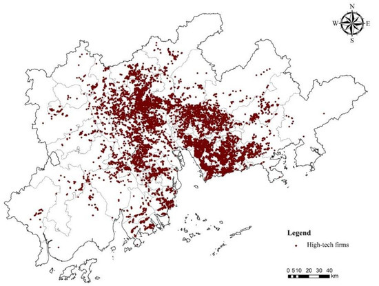 The high-tech firms’ datasets were collected from the list of high-tech firms that was announced by the Guangdong Provincial Department of Science and Technology. Firms’ latitude and longitude coordinates were obtained through the application programming interface of the Baidu map, using the geocoding technology. Afterwards, we performed a coordinate transformation and eliminated the outliers to construct the spatial database. This database covered a total of 12,516 firms in the PRD in 2017 (Figure 4). It is important to mention that the research objects targeted in this study mainly comprise small- and medium-sized technology enterprises (SMEs). Due to the current recognition rules concerning China’s “high-tech enterprises,” small-sized and small profit-making enterprises (小型微利企业) that meet the requirements will be eligible for a 20% corporate income tax exemption, and high-tech enterprises reliant on state support will benefit from a 15% corporate income tax exemption. This provision has prompted a keenness in many conforming SMEs to be included in the list of high-tech firms to reduce operating costs. Therefore, most of the identified high-tech firms are newly established SMEs, and these enterprises also represent the latest technological developments in the region [43]. During 2018–2019, we interviewed relevant personnel from the Guangdong Provincial Science and Technology Department, as part of the research for the “Guangdong Province Comprehensive Innovation Reform Assessment” project. They confirmed that the high-tech enterprise directory mainly comprises small- and medium-sized science and technology enterprises.