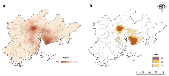 The spatial distribution characteristics and the hotspots of high-tech firms in the PRD are investigated using the KDE method. Results from KDE analysis is shown in Figure 5, which reveal a significant clustering trend. Specifically, most of the firms are concentrated in Tianhe and Yuexiu districts in Guangzhou and in Nanshan and Futian districts in Shenzhen. Two significant distribution cores are observed in Guangzhou and Shenzhen, respectively (Figure 5a). There are 7216 high-tech firms in Guangzhou and Shenzhen, which account for 57.65% of all the high-tech firms in the study area. We further calculated the global Moran’s I index, which characterizes the spatial autocorrelation and strength. The global Moran’s I index for the density of a county-level high-tech firm is 0.1511 (p = 0.0000; z = 6.2066). This value indicates that there exists a significant spatial autocorrelation. The result is consistent with the findings of a large number of studies [18,25,30]. These studies have found out that innovation tends to be more concentrated than traditional production or manufacturing activities across and within a city and metropolitan area. In part, it is attributed to the need for setting up clusters in the early phase of innovation activities associated with research, design, and testing of new products.