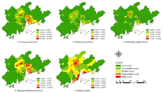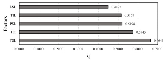 The value of the five significant impact factors were classified into five levels using the natural breaks (Jenks). The spatial distribution of these factors is shown in Figure 6. Based on the GD technique, we estimated the impact intensity of these five factors, as shown in Figure 7. By organizing these factors according to their impact intensity, we found TSL (0.6641) > HC (0.5745) > PSL (0.5198) > TIL (0.5159) > LSL (0.4497). This result shows that the TSL has the strongest impact intensity, among the built environment factors, and HC also has a relatively strong impact intensity, among the urban fundamental factors. However, the impacts of the TIL and LSL on the location selection of high-tech enterprises are less significant.