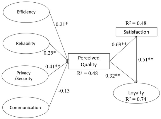 Table 2 shows the results of the first step of the study, where a CFA was carried out for the items comprising the scale. As we can see, the four expected dimensions, efficiency, reliability, privacy and communication are defined, as well as loyalty (measured by two items). Convergent validity is demonstrated, firstly, by the factor loadings, which are greater than 0.5 [74], and secondly by the average variance extracted (AVE) for each of the factors, which are also greater than 0.5 [75]. The reliability of the scale is confirmed by the Cronbach’s α indices of each of the factors, which are greater than 0.7.