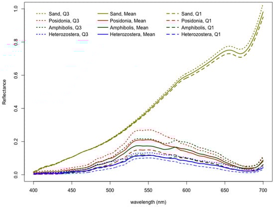 Spectral reflectance profiles of dominant benthic bottom types in study area with 75th percentile (Q3), mean (average), and 25th percentile (Q1) showing variation of measurements for each wavelength.
