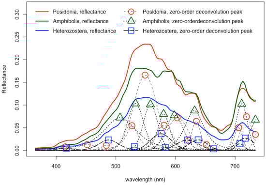 Moreover, first-derivative deconvolution analyses helped to reveal 11 distinct peaks within the visible spectrum (417, 456, 474, 491, 522, 590, 605, 621, 631, 649, and 681 nm) that were useful to differentiate Posidonia and Amphibolis (Figure 4a and Table S2). These analyses of first-derivatives further highlight differences between Posidonia and Amphibolis, with a Posidonia peak at 439 nm that has an order of magnitude higher reflectance than that of Amphibolis at 437 nm, as well as Posidonia spectral peaks at 542 and 556 nm with higher reflectance values than those of Amphibolis at 545 nm (Table S5). Additionally, first-order derivative peaks located at 455, 525, and 605 nm were used to separate and resolve Heterozostera from both Posidonia and Amphibolis.