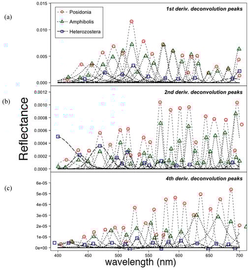 (a) First derivative, (b) second derivative and (c) fourth derivative deconvolution peak analyses of dominant seagrass bottom types in the study area.