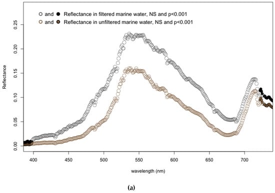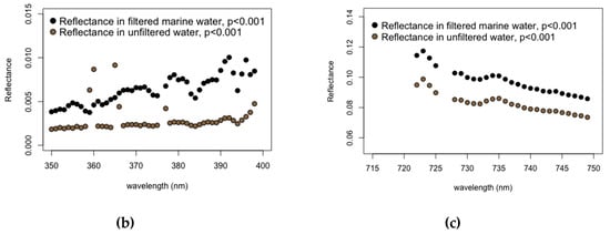 (a) Reflectance of seagrasses measured in filtered marine water and unfiltered marine water. Note that “NS” refers to p-values being not significant. (b,c) Insets of statistically significant reflectance values of seagrasses from 350–400 nm, and from 720–750 nm, respectively.