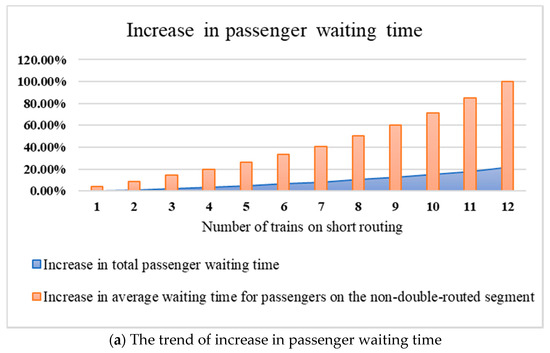 The service level is closely related to passenger waiting time. From Table 11 and Figure 17, it can be seen that the total passenger waiting time increases, with the number of trains on the short routing increased. In order to ensure the service quality, the number of trains on the short routing cannot be too many. Therefore, we can determine the maximum number of trains on the short routing based on the service quality requirements of the metro operation company.