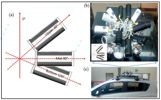 The vehicle was equipped a system including POE, which was connected to 12 cameras, with the vehicle providing the power. The cameras weighed only 15 kg; therefore, no tools or devices were used to secure the cameras to the roof of the vehicle. A cable was used to connect the power supply to the laptop, held within the car. All IP cameras used were capable of being connected in multiples to one POE to transfer images, and the IP camera used has an advantage to develop and adjust various functions. As shown in Figure 3b, 360° shooting was conducted using 12 IP cameras. Multiple camera angles (40°, 90°, and 120°) were used to capture images of high-rise buildings, and small-sized cameras with a wide-angle view were mounted on the vehicle as a platform.