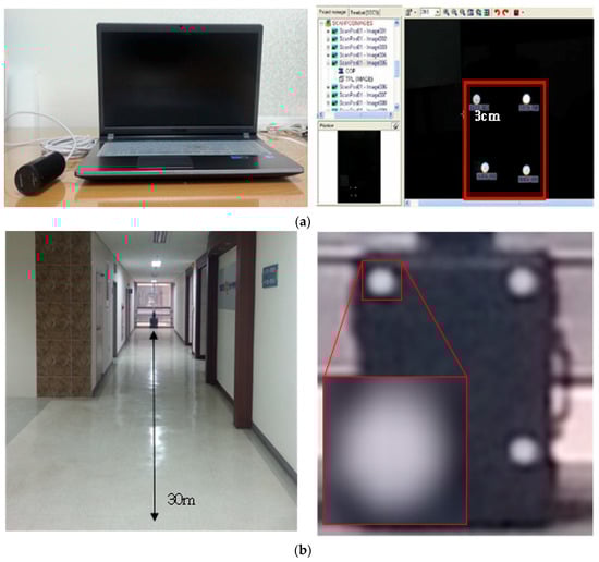 To evaluate GSD, methods provided by the National Geographic Information Institute were used []. Article 15, Section 2 of the Implementation Regulations for Road Traffic Act of South Korea, lanes should have a width of ~3 m. Therefore, it was decided to use 30 m as the distance from the camera to the building in this study after considering the number of maximum traffic lanes (Figure 4b). An IP camera was connected to a laptop, and an object was photographed from 30 m away to confirm the resolution of the MMS. This process was implemented using RiscanPro [], a commercial software that is calibrated for the digital camera. This module analyzes the resolution of images by identifying the reflection intensity of the reflector (Figure 4a). As illustrated in Figure 4b, the target (white dot) was represented without large-scale distortion, despite its small (3 cm) size and distance from the camera. In general, lens distortion depended on the object location; however, this assessment was necessary to assess the capabilities of the camera and determine proper distances to take pictures from a car.