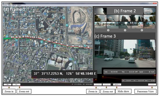 Figure 6a shows a map of the vehicle traveling between 30 and 60 km/h from 1 PM to 2 PM on Toegye road in Sindang-dong, Seoul, South Korea. The red line denotes the route of vehicle movement, and the circles on the line indicate points where the images were taken. Images were taken every second, and the image points were recorded on high-resolution aerial photographs. The high-resolution aerial photographs are used as a base map in this study, and the spatial resolution was 50 cm. Furthermore, the aerial photographs are embedded into the Daum mapping service, a web portal in South Korea. In the software, 12 images from every point where images were taken were shown and enlarged to compare and analyze the image quality. A module was developed to create 12 geotagged images with GPS information, and aerial photographs that were available in the software package using Wi-Fi and a 1/5000-scale topographic map were used in areas with no Wi-Fi while the vehicle was moving.