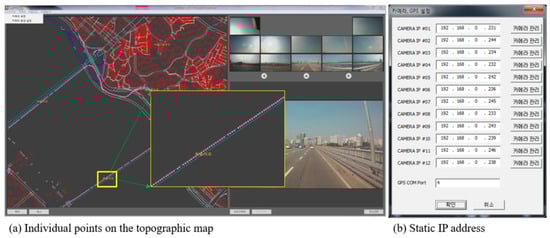 The topographic map can be found in the application software using the menu bar. Figure 6a shows the individual points on the topographic map to indicate the trajectory of the vehicle as a whole, whereas Figure 6b shows the camera menu and has the static IP address and GPS port for each camera. The POE was used as a communication channel (incorporating internet technology) with a virtual internal IP assigned to each port of the POE. The signals were transmitted to the cameras through the POE.