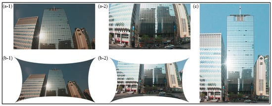 Figure 8a indicates the original images and Figure 8b shows the distortion of acquired images from MMS. The distortion of the images appeared because of the properties of the lens, which is known as lens distortion. Distortion was increased at the edges of the images, and the empirical experiments performed in this study indicate that buildings taller than 10 stories or that were farther than a certain distance from the MMS device exhibited more serious distortion.