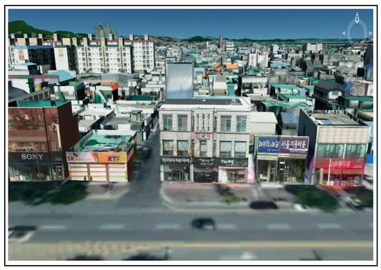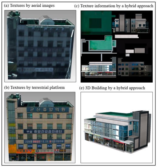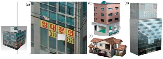 Figure 9 shows geometric shapes with textured images. To texture 3D objects, this study used an application developed by Dr. Lee, which automatically produced multiple aerial images for texture mapping and allowed a user to manually select the best-quality texture image []. Figure 9a shows the textured 3D building; however, the texture images for most low-level buildings have poor-quality textures and are blurry []. Thus, texture information on low-rise buildings (below the fifth floor) from the developed MMS was used to ensure high-quality results. This working process uses the same procedures as those developed by Dr. Lee. Note that on the 3D geometric objects, the texture information acquired from MMS is manually attached to the 3D buildings.