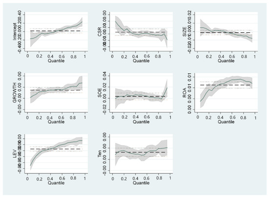 As studied earlier, the OLS model described the average relationship between CSR disclosures and FC based on the conditional mean of cash flows. The impact of CSR disclosures may change throughout the distribution of cash flows. Thus, we use QR in Equation (7) to infer information on the co-movement between CSR disclosures and FC in specific cash conditions, as reported in the upper half of Table 4. The QR coefficient estimates are plotted in Figure 1, with 95% confidence interval along with the OLS estimates. As for quantile coefficient estimates, we plot the nine-quantile regression estimates for τ = 0.1 to 0.9 as the solid green curve with 95% confidence interval (shaded area). In particular, the results indicate that changing the conditional distribution, the effect of CSR disclosures changes on cash flows varies in size.