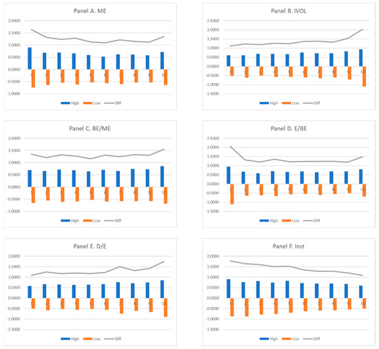 The second methodology used in this study is that of Baker and Wurgler (2006) [11]. They showed that the effect of sentiment is stronger for difficult-to-arbitrage firms using a sorting test and long–short portfolio regressions on sentiment, where portfolios are formed based on firm characteristics. Aboody, Even-Tov, Lehavy, and Trueman (2018) [31] and Shen, Yu, and Zhao (2017) [59] also used sorting and long–short portfolio tests and found similar results to those of Baker and Wurgler (2006) [11]. Thus, we use these methodologies to investigate whether the effects of overnight returns are more prominent for difficult-to-arbitrage firms. More specifically, we create ten value-weighted portfolios based on firm characteristics at each quarter end and calculate the value-weighted and overnight returns for each portfolio. Then, we divide the full sample period into periods of high and low overnight returns (i.e., above and below the median, respectively) for each portfolio and also analyze the next-day returns of each portfolio. We also analyze the differences between the returns in high and low periods. Then, we construct a long–short portfolio based on firm characteristics and analyze the effect of overnight returns on the returns to this long–short portfolio.