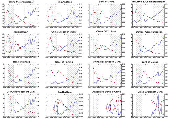 Second, we use a market-based approach to measure the systemic risk of the banking sector due to the limitations associated with the traditional accounting measures that are widely used in the literature. Accounting measures of the systemic risk of the banking sector heavily rely on the financial statements of banks, such as the NPL ratio, earnings, profitability, and asset liquidity. Because accounting statements are reported with a delay and only measured quarterly, accounting measures of the systemic risk do not include real-time or short-term risk measurement [19,20,21]. Furthermore, accounting-based measures are exposed to the manipulation and amendment of accounting principles. The unique definition of NPLs in China is another reason why market-based measures are used. The Chinese definition of NPLs excludes low-quality loans transferred to state-owned asset management companies; thus, NPLs of Chinese banks are underestimated [18]. In addition, market-based risk measures could reflect the risk of the fast-growing shadow banking industry in China, while accounting-based measures cannot, due to the off-balance sheet nature of the business [22]. The size of China’s shadow banking system was estimated as ranging from 13.7 trillion RMB to 30 trillion RMB during 2012–2013. This is about 14–31% of the aggregate assets of Chinese banks and approximately 26–57% of the GDP in 2012 [22]. Assessing the systemic risk of the banking sector based on accounting measures would result in an underestimation of the true insolvency risk of the banking sector.