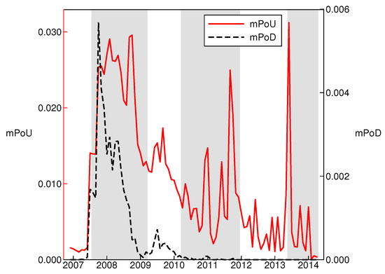 Systemic risk of the banking sector (mPoU and mPoD). The shaded areas represent the crisis periods: (i) August 2007–March 2009, the sub-prime mortgage crisis; (ii) April 2010–December 2011, the European sovereign debt crisis; and (iii) June 2013–April 2014, the Chinese cash crunch.