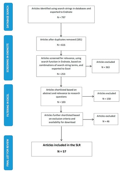 References were exported into Endnote and filtered for duplicates, resulting in a total of 616 original articles. Titles and abstracts were scanned to identify articles that included the selected keywords. The resulting references, including authors, year of publication, title and abstract, were then exported to an Excel spreadsheet to facilitate filtering and further analysis. The number of articles exported to Excel was 253. In Excel, each article’s abstract was reviewed to give priority to those that were directly relevant to the research objectives. 103 articles were initially identified; however, some of these were grey literature, books, and book sections and were thus excluded. Furthermore, not all articles were available for download and were also eliminated. The resulting final shortlist of articles was 57. A flow diagram (Figure 1) based on the PRISMA 2009 Flow Diagram [40] shows the literature search process of article selection for the SLR.