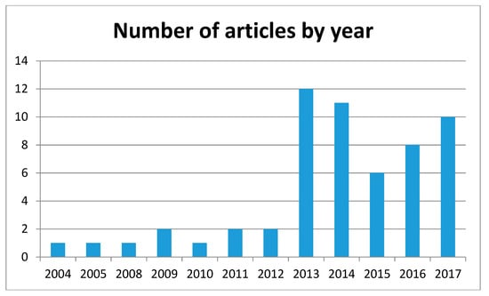 All the articles reviewed were written in the last thirteen years, with the majority (82%) written in the last four years, providing some evidence that the integration of ecological systems thinking with urban design and planning is a relatively new and expanding field of research [24,29]. This is shown in Figure 2.