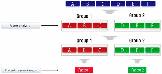 Figure 1 illustrates the method of selecting representative indicators using factor analysis and PCA. Assuming that there are six indicators A–F, they can be grouped by factor analysis, and the ones that have high explanatory power can be selected using PCA. In this way, the complexity of the FRI can be effectively reduced.