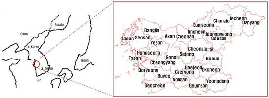 This study targeted the Midwest region of the Republic of Korea, including Daejeon Metropolitan City, Sejong Special Self-Governing City, Chungnam Province, and Chungbuk Province. The area consists of 28 cities and gun (districts or counties in Korea), including two municipalities, 11 cities, and 15 gun (see Figure 3). The advantage of the area is that it provides various geographical environments to select flood risks because it encompasses large cities, small and medium cities, coastal cities, mountainous regions, and rural areas.