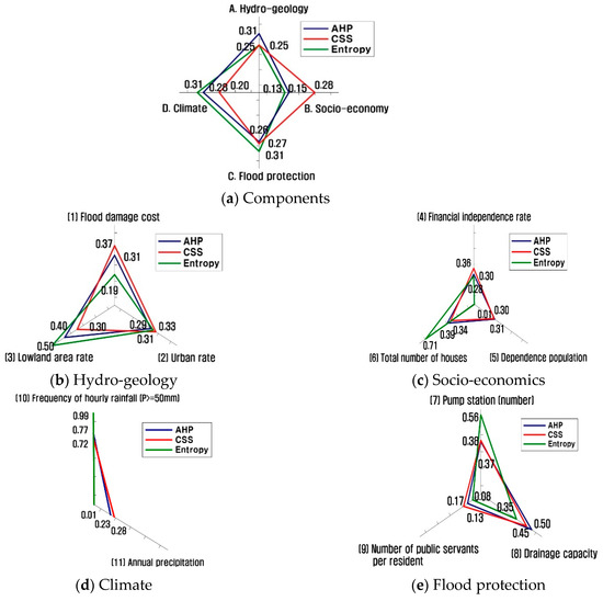The indicators within a component showed a different aspect in the survey and entropy methods: the entropy method showed higher weight values for specific indicators, while the surveys showed relatively similar weight values for the indicators. This was due to the unique characteristics of entropy, which increases when deviations between alternatives are low. Moreover, the deviations between the normalized values of the indicators were small. However, the number of public servants per resident indicator of the flood protection component and the annual precipitation indicator of the climate component were low, and divisions in indicators between regions were high, which resulted in low entropy weights.