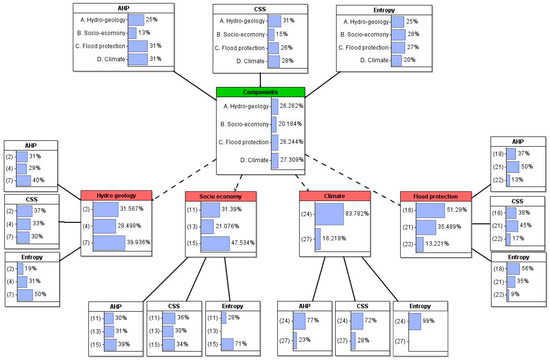 The estimated weights affect the outcome of the estimated flood risk. It is not easy to determine the weights for each component and indicator, particularly when the entropy weight is higher than the other weights, such as for the total number of houses in Table 4. Thus, the BN method was used to estimate the combined weights while considering causal relationships between weights obtained from the AHP, CSS, and entropy techniques. First, a BN with 20 nodes and 19 links was constructed with AgenaRisk 10, as shown in Figure 5. The BN was constructed in consideration of the relationships between the components and indicators. The pre-probability assigned to each higher node can be inferred directly from the conditional probability, and the deviation of the probability determines the post-probability of the lower nodes. That is, the post-probability (the integrated weights) can be derived from pre-weights (the current weights), the conditional probability of each component (hydro-geology, socio-econometrics, flooding protection, and climate), and its indicators. As each component was weighted separately, it will not affect its indicators and can be expressed as dotted-line links that have indirect influences. Table 4 shows all of the probabilities (weights) of each component and indicator obtained from the configuration in Figure 5 and the post-probabilities (integrated weights).