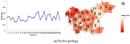 Table 2 shows the results of the factor analysis. The hydro-geology, socio-economic, and protection components were classified into three groups, whereas climate was classified into two groups. Kaiser–Meyer–Olkin (KMO) [34] and Barlett’s test of sphericity [35] were used to determine the appropriateness of the analysis. The Kaiser–Harris measurement [34] was used to select principal components that have an eigenvalue of 1 or higher (see Table 2). The result of each component was determined to be significant because KMO remained at 0.5 or higher, and the probability value (p) remained below 0.05.