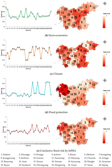 The final InFRA was estimated for hydro-geology, socio-economics, flood protection, and climate components in 28 cities in the Chungcheong Province using several formulas (see Figure 4). As a result, InFRA did not show a significant gap between regions except for some areas and showed a flood risk of 0.3–0.5 in most places. The resulting values for Seosan (17), Dangjin (20), and Taean (27) were close to 0.7, despite their low risk from the socio-economic component. This occurred because the risk from the other components was high. Some village areas including Jeungpyeong (8) and Jincheon (9) showed a low InFRA level because they had a low level of flood protection and other components. The risk related to the hydro-geology component was high in the countryside because these areas are more influenced by flood damage, and there are more lowland areas than urban areas. In the socio-economic component, the indicators of the total number of houses and financial independence rate showed a high risk in large cities, followed by some villages that have a high dependent population.