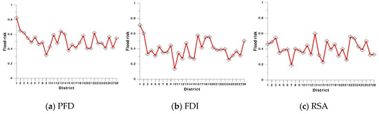 The proposed method was compared with other three methods used to assess flood risk: PFD, FDI, and RSA [15,17,21]. The three methods are the most popular in a practical field because they are easy to collect data and simple to apply. These methods are briefly explained in Table 5. However, the same assessment criteria must be used to compare the two sets of methods. The other assessment methods use various criteria with grades (1–5) or groups (A–D), and thus, comparing the methods using the same set of criteria is not appropriate. Therefore, they were compared in an alternative way using risk values between 0 and 1 instead of using grades or groups for a consistent comparison. In all the assessment methods, the risk of flood increased when the risk value was closer to 1, indicating that appropriate measures need to be taken for flood mitigation.