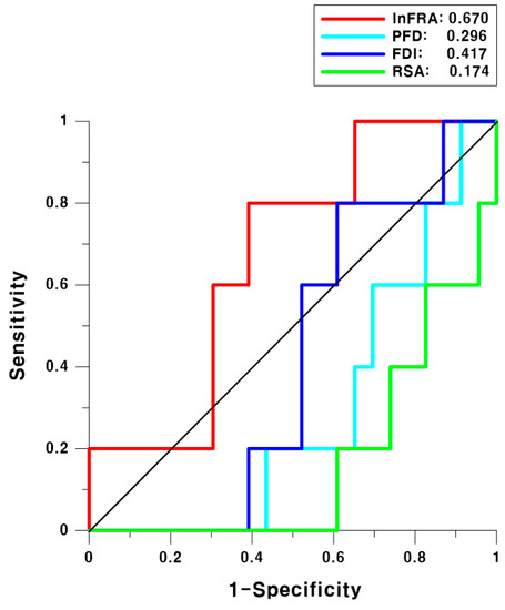 This comparison was qualitative, and a quantitative comparison is necessary. Therefore, the methods were validated by analyzing the area under the curve (AUC) of the receiver operating characteristic (ROC) curve. The ROC curve is a graph where the x-axis shows the specificity, which indicates the probability of the estimated value being false. The y-axis shows the sensitivity, which indicates the probability of the estimated value being true. That is, the evaluation method is better if the risk assessment is more likely to be correct and has a lower false probability rate. A higher AUC indicates higher accuracy of the prediction, and the accuracy of the results increases as AUC approaches 1.