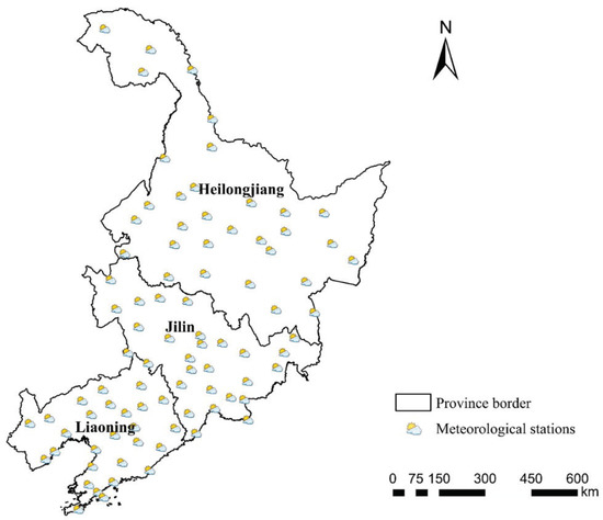 Data for maize growth periods between 1993 and 2013 were obtained from the Crop Growth and Farmland Soil Moisture dataset provided by the National Meteorological Center of China, which records the date of crop development and other data rely on the agricultural meteorological stations. Meteorological data from 1993 to 2013 were obtained from National Meteorological Center of China, including daily average temperatures, daily average rainfall and sunshine duration. The maize planting area data came from county-level economic statistics data of the Ministry of Agriculture. The elevation data came from the SRTM (Shuttle Radar Topography Mission) 90m resolution DEM (Digital Elevation Model) data, and the spatial analysis function in ArcGIS was used to process the DEM data to obtain the slope data. The Three Northeastern Provinces of China and the meteorological stations are shown in Figure 1.