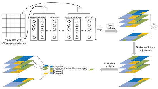 where is the sum of squared deviations in category t, and T is the sum of squares of total deviations for n samples. R is the ratio of sum of squared deviations between interclass to the sum of squares of total deviations for all samples, and it increases as the number of clusters increases. The semi-R statistic is the decreasing of the sum of squared deviations of interclass after merging a new category. The objective of clustering is to have small intraclass differences and as many differences between classes as possible. Therefore, we assume that the number of categories is optimal when both the R and semi-R statistics are relatively large.The spatial structure flow of the spatiotemporal classification is shown in Figure 2.