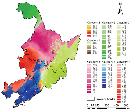 We set the number of categories as 2–9 and calculate the corresponding R and semi-R statistics to determine the final number of categories, which was 7. Through the spatial continuity adjustments and category attribution analysis of the clustering results for twenty years, the spatiotemporal classification result of the maize planting environment in the three northeastern provinces was obtained (Figure 3). Of the three digits in the legend, the first digit represents the final attribution category of the geographical grid, the second and third digits indicate the geographical grid’s attribution degree to the final attribution category. For example, “252” indicates that the final geographical category of the geographical grid is environmental category 2, and the degree of attribution is 52%; “700” indicates that the final geographical category of the geographical grid is environmental category 7, and the degree of attribution is “100%”.