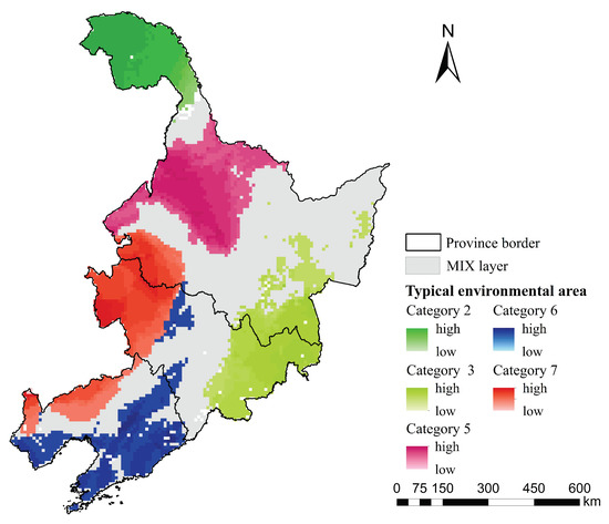 According to the geographical grids’ attribution degree to the final attribution category, the result of spatiotemporal classification was divided into typical environment regions corresponding to each environmental category and the MIX layer (Figure 4). Environmental categories 1 and 4 only covered small areas, and the attribution degree of these geographical grids was less than 50%. So, environmental categories 1, 4, and geographical grids whose attribution degree in other environmental categories were less than 50% composed the MIX layer.