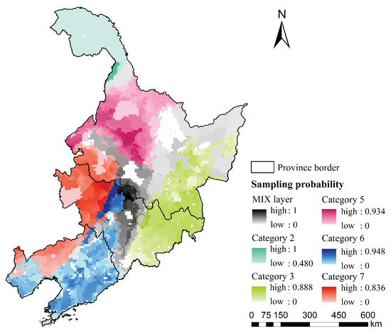 After calculating the environmental representativeness of the geographical grids and setting the weight of environmental representativeness and the weight of the maize planting area both to 0.5, the sampling probability raster was built (Figure 5). In the sampling probability raster, the deeper the color of the geographical grid, the higher the probability of its selection as the test site in that particular color series (i.e., the same environmental category). It can be seen that the probability at the junctions of environmental categories is higher than that in other regions.