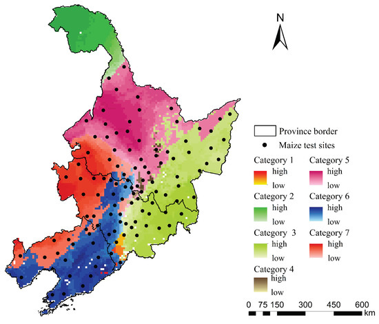 Maize test sites layout based on spatiotemporal classification of planting environment. An environmental category is expressed by color series, with the geographical grids’ attribution degree to the final attribution category indicated by pale to deep color gradients, which indicate small to large attribution degrees.