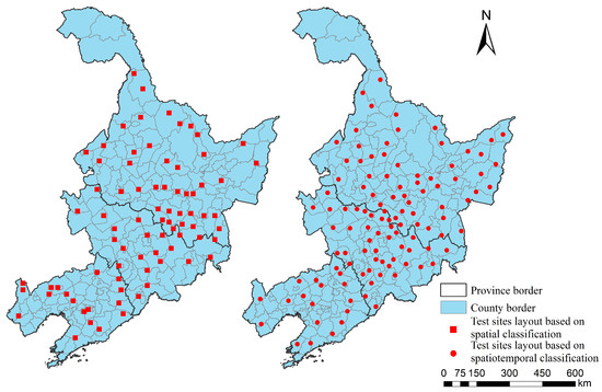 In previous studies, most of which have used spatial classification of planting environment to lay out test sites [20,24], planting environment classification methods have been designed to identify the environmental characteristics that have remained relatively stable throughout the years. We referred to Zuliang Zhao’s [20] test sites layout method based on the maize planting environment spatial classification to analyze the Three Northeastern Provinces of China. The calculation method, parameter setting of the number of test sites, and the indicators of the sampling probability grid were consistent with this study. A comparison map of the sites layout is presented in Figure 7. Firstly, the number of test sites obtained by the two methods is different: the number of test sites based on spatial classification and spatiotemporal classification is 82 and 112, respectively. The reason for this divergence is that the latter method considers the spatial and temporal environmental variability, while the former only considers the spatial environmental variability, resulting in the deviation of environmental characteristics of the latter is greater than the former. Secondly, the dense areas of the test sites layouts are different. The test sites based on spatial classification are slightly denser in the central and eastern parts of the Three Northeastern Provinces of China than other regions. The test sites based on spatiotemporal classification are mainly concentrated in the middle of the Three Northeastern Provinces of China, mainly because of the frequent changes in environmental characteristics in the central region and the obvious differences in temporal and spatial differentiation. Regions in which these environmental categories change frequently are also maize intensive; therefore, test sites need to be placed in these regions as well.