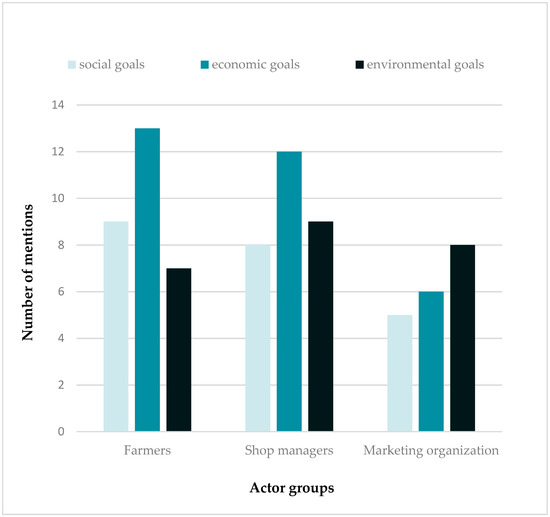 Relating the goals to the different dimensions of sustainability for each actor group revealed different foci (see Figure 1)—farmers and shop managers chose a wide range of different sustainability goals, most frequently from the economic dimension. In contrast, the marketing employees selected a smaller variety of goals, with a light emphasis on the environmental sustainability dimension.