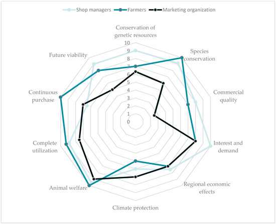 A comparison of the overlapping sustainability goals and the ratings of the different groups provided further insight into the production side of the value chain (see Figure 2). We found congruency in the ten goals, meaning that at least one person from each group chose them. A consensus among the three actor groups was shown, for example, on the implementation of ‘animal welfare’ and ‘regional economic effects’. The shop managers and farmers rated the goals ‘commercial quality’ and ‘species conservation’ similarly high, but these goals were rated considerably lower by the marketing organization. The shop managers and marketing employees shared a similar opinion of the goal ‘continuous purchases’, while the farmers rated this goal higher. In contrast, ‘interest and demand’ was rated far higher by the shop managers, while the farmers and marketing organization equally rated this goal lower. The same result was found for the ‘conservation of genetic resources’.
