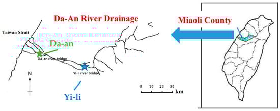 The relative positions in this study used to sample the surface river sediment. The Yi-Li river sediment sample location (blue star mark) and the Da-An River sediment sample location (green stat mark) are located on the Da-An River, Miaoli County, Taiwan.