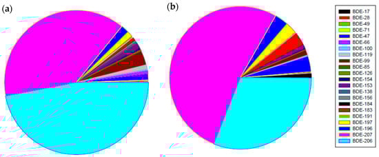 The percentage of total amounts of 23 PBDEs in the sediment samples (except BDE-209): (a) Yi-Li sediment (total 22 PBDEs); (b) Da-An sediment (total 19 PBDEs).