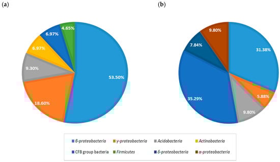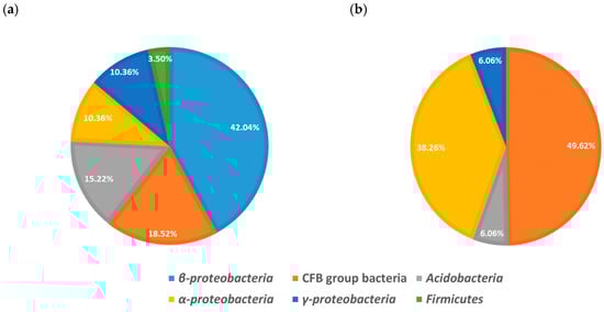 The phylum-level bacterial community as percentages present in the BDE-209-contaminated Da-An microcosms: (a) In the dark environment; (b) in the UVA irradiation environment.