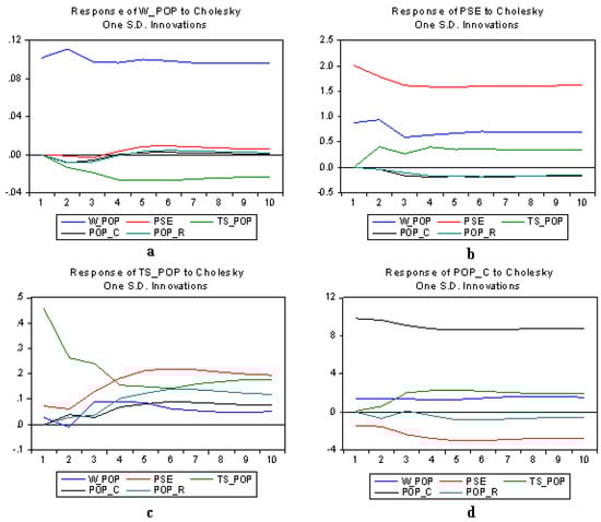 Response of W_POP (a), PSE (b), TS_POP (c), POP_C (d), POP_R (e) to Cholesky One S.D. Innovations, and Inverse Roots of AR characteristic polynomial (f).