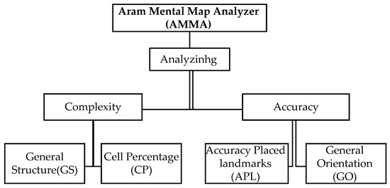 The mental image of citizens related to the environment is diverse but obtaining a common pattern is of importance in the field of mental maps research. The AMMA software is programmed on this basis to consider landmark points and paths depicted in mental maps as turning points regarding sketch maps analysis as well as examining the mental complexity of individuals. In this regard, this program is based on two main structures: 1- accuracy and 2- complexity of mental maps (Figure 1). The analysis of the precision of mental maps actually focuses on depicted landmarks and paths by respondents and encompasses two factors that is, General Orientation (GO) and Accuracy Place Landmarks (APL). Mental maps complexity analysis also consists of two factors, that is, General Structure (GS) and Cell Percentage (CP), which assess the degree of individuals’ mental complexity based on studies by Appleyard [48], Walsh, Krauss and Reigner [49].