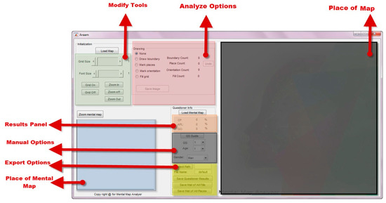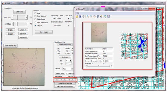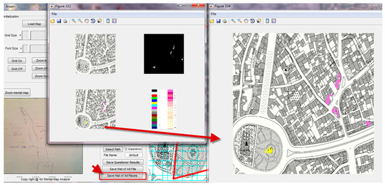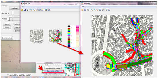 For this purpose, the AMMA mechanism is designed so that in a simple environment, the mental maps can easily be transferred to the software environment (main map) with all their drawing features using graphical tools in order to address mental map features based on the locations of landmarks and depicted paths for the accurate analysis of individuals’ perceptions towards their surroundings using common patterns derived from the mentioned maps. AMMA is programmed in MATLAB and its data processing method is based on image processing as a raster data. As seen, it is possible for the user to mark spots on the main city map using the tools provided in the software environment on the basis of depicted maps and to present results as numerical data and analytical maps. In essence, the main function of the AMMA software is the conversion of qualitative data resulting from mental maps into numerical data along with an analytical map in the form of individually or generally depicted maps. Generally, it can be said that the program has two inputs: the main map of the study area (as the basis for numerical calculations) and the mental maps (qualitative data). Firstly, by using the tools in the software the researchers implement the information (determination of the region, landmarks and paths) on the main map. Afterwards, the mental maps (qualitative data) are entered into the software and the drawings of the questioners (mental maps) are transferred to original maps using the software tools. Based upon the analyses outlined in the following sections (Section 3.1 and Section 3.2), they are extracted as numerical outputs. Additionally, in the form of colour spectral diagrams (based on calculations), graphical outputs are presented.