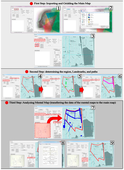Process of AMMA to input the maps and data to analyzing. 1&2. The main map of the area is entered, by clicking on the icon Load Map (JPG, TIFF or PNG file). 3. Gridding the map entered in the AMMA by the option “Grid on/off,” as well as it is possible to change the grid size through “Grid Size” option. 4. Drawing the districts of the study area on the map as a pen called “Draw Boundary.” We can also change the line thickness as much as we want. After drawing the scope, by clicking on the icon Save Image the grids located in the district of the study area are counted and saved. 5. In the main map the landmarks are determined by an option called “Mark Place”. To save points in software we click Save Image icon. Then, it is observed that coloured points are disappeared and save to AMMA. 6. Another option called “Mark Orientation” works like “Mark Place” option and enables us to specify the main orientation of the map including the main crossing streets or paths with different colours (pink). 7. In this step, the citizens’ mental map is entered through pressing “Load Mental Map” button to import mental map of responders to begin the analysis process. After entering the citizens’ mental maps, we spot the map based on the mental map of citizens through an option called “Fill Grid.” 8. In this step, we score the structure of mental maps based on the Appleyard’s model, the scoring is manually inserted while there is an icon called GS Guide so that users can score more accurately. 9. Here, respondents’ information including age and gender are entered for a more detailed review and analysis of the data. At last the button “save Image” should be pressed to save the data and disappear the information of pervious responder to import new mental map.